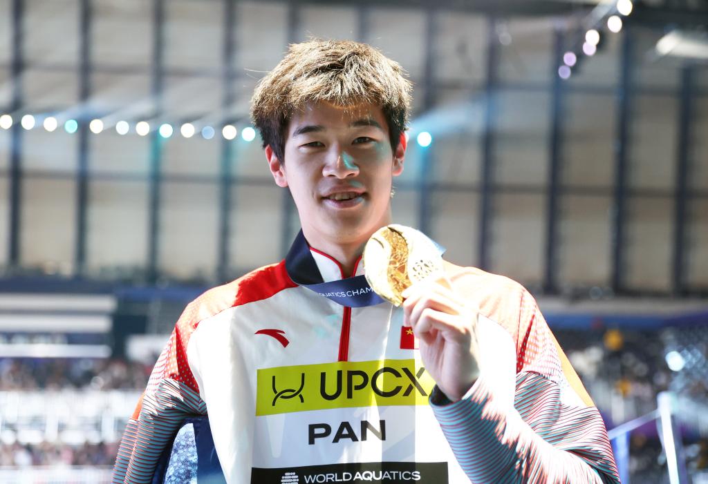 2023年9月24日,冠军中国选手潘展乐在颁奖仪式上。潘展乐以46秒97的成绩获得冠军并创造男子100米自由泳新的亚洲纪录。新华社记者 黄宗治 摄