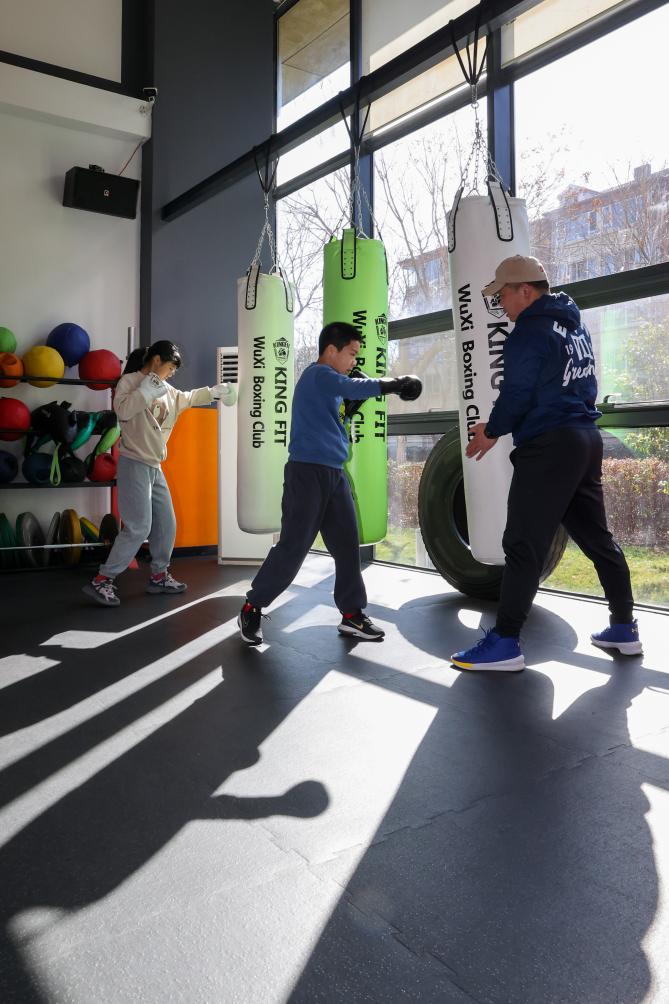 近日的上海,屋外冰雨绵绵,运动馆内却是热火朝天。晚上八点半,六七个学员正大汗淋漓地击打拳击桩。