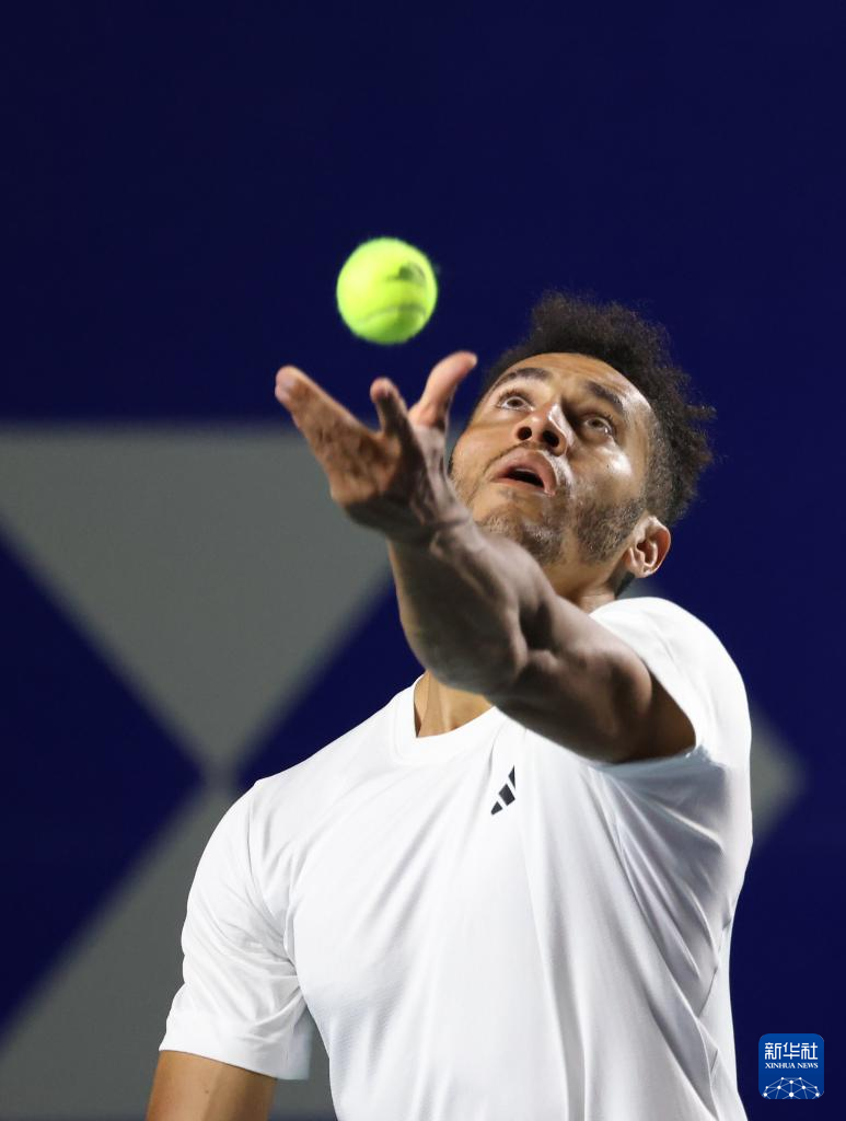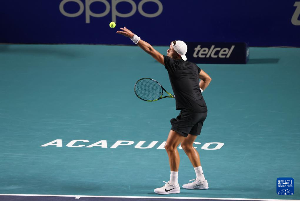 2月27日,美国选手迈克尔·莫在比赛中发球。新华社记者 李梦馨 摄