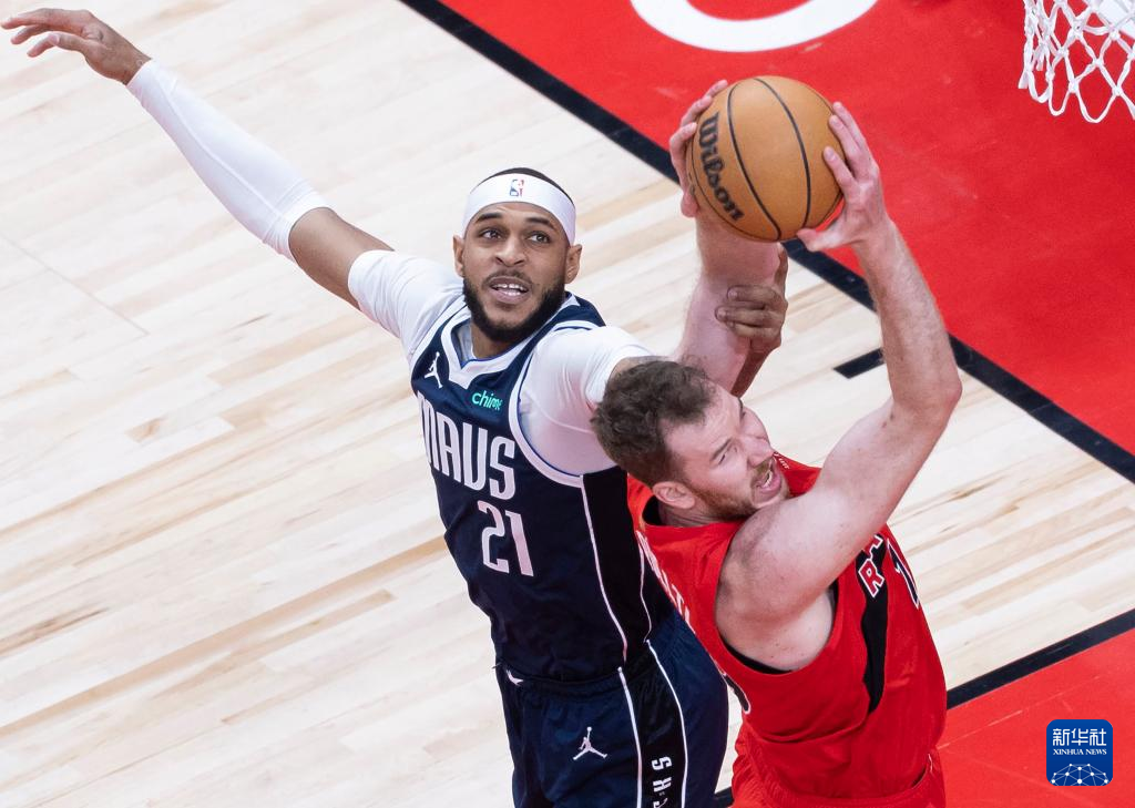 2月28日,猛龙队球员珀尔特尔(右)与独行侠队球员加福德在比赛中争抢。新华社发(邹峥摄)