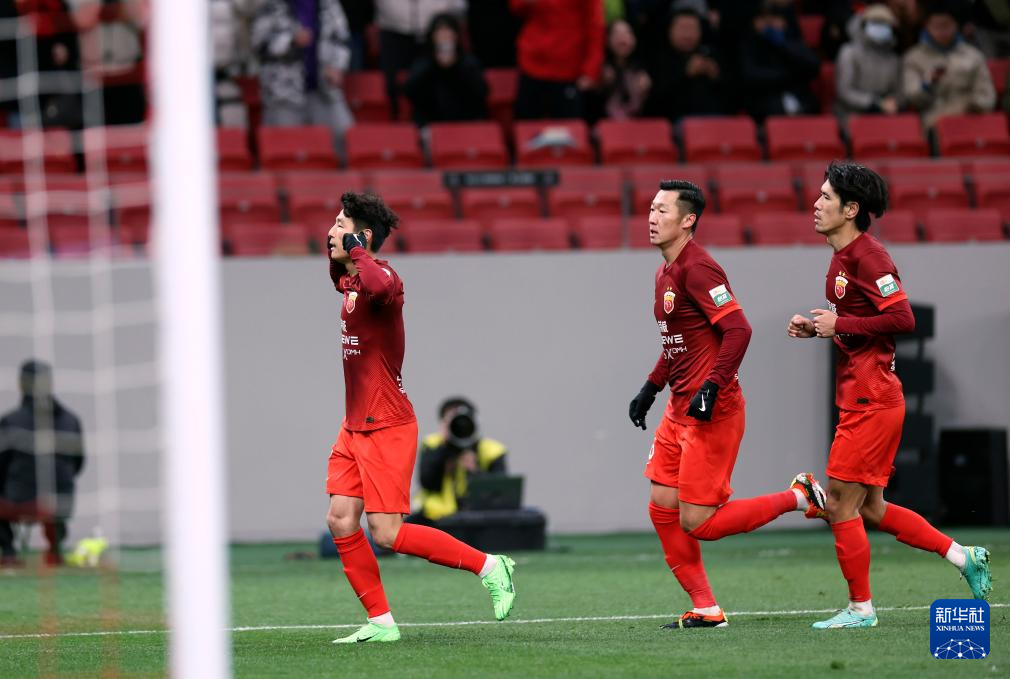 3月1日,上海海港队球员武磊(左)在进球后庆祝。