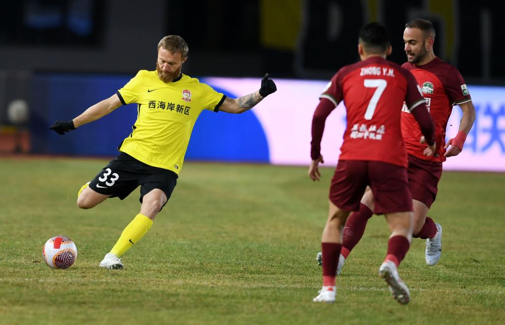 3月1日,青岛西海岸队球员哈罗扬(左一)在比赛中传球。新华社记者 李紫恒 摄