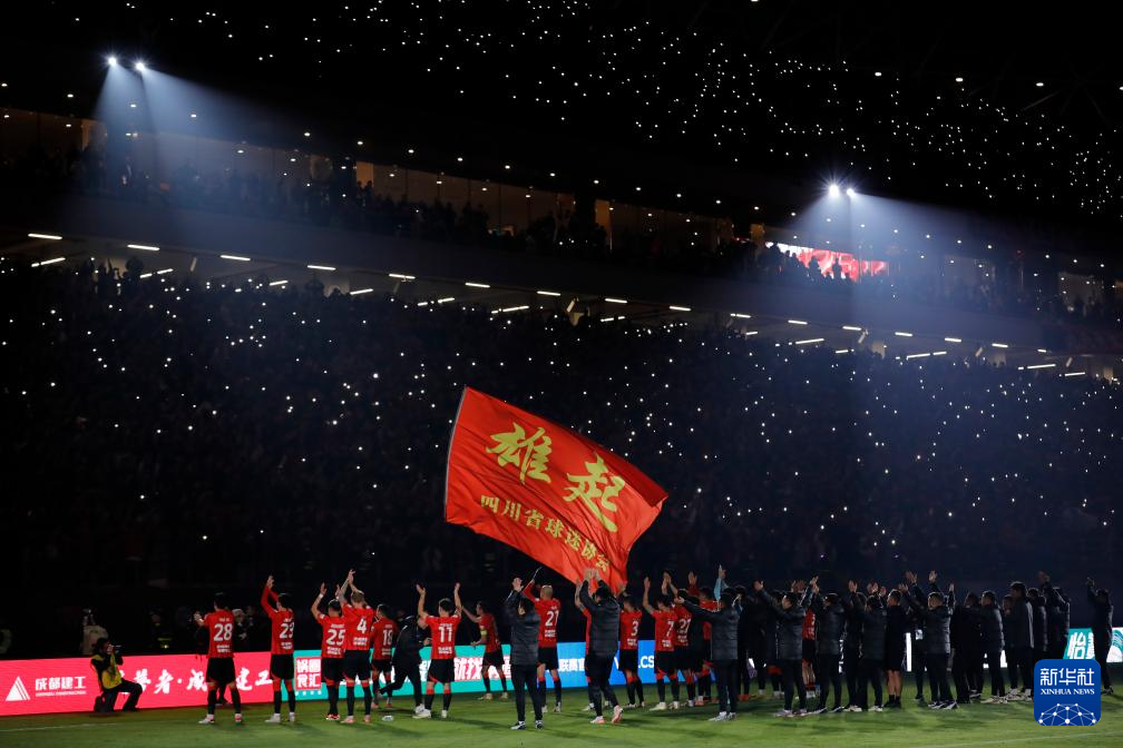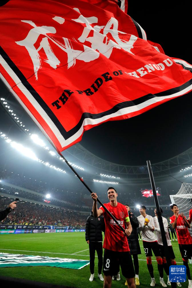 3月2日,成都蓉城队球员周定洋(前)在比赛获胜后挥旗庆祝。新华社记者 沈伯韩 摄