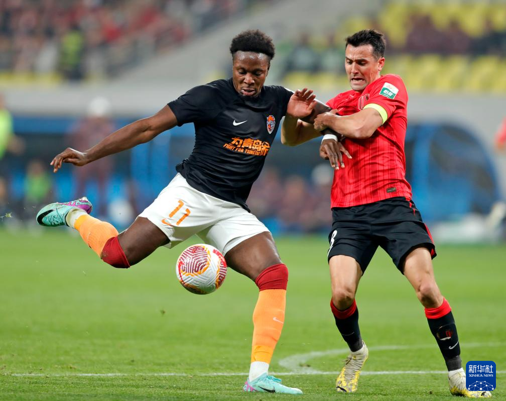 3月2日,青岛海牛队球员博阿基耶(左)与成都蓉城队球员周定洋在比赛中拼抢。新华社记者 沈伯韩 摄