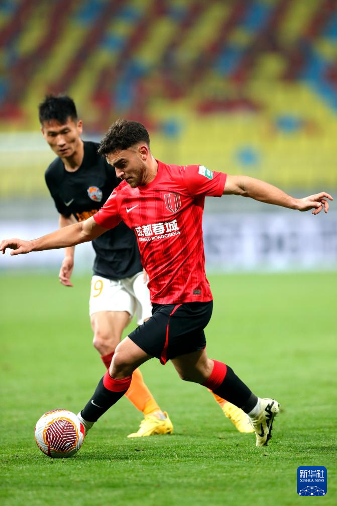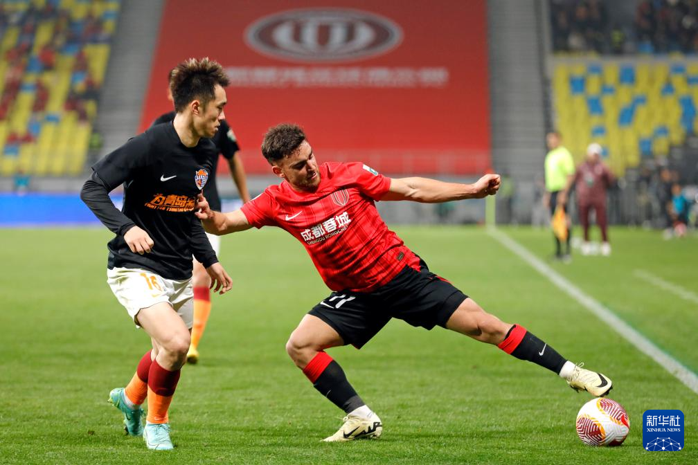 3月2日,成都蓉城队球员古尔芬克尔(右)在比赛中控球。新华社记者 沈伯韩 摄
