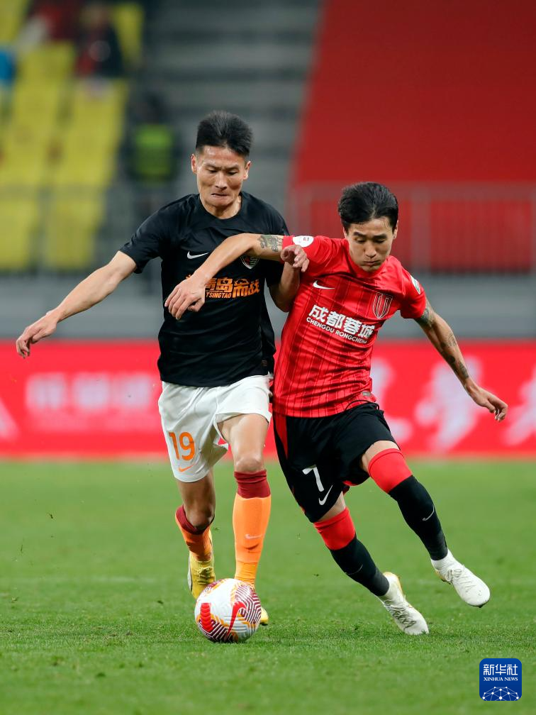 3月2日,成都蓉城队球员韦世豪(右)与青岛海牛队球员宋文杰拼抢。新华社记者 沈伯韩 摄
