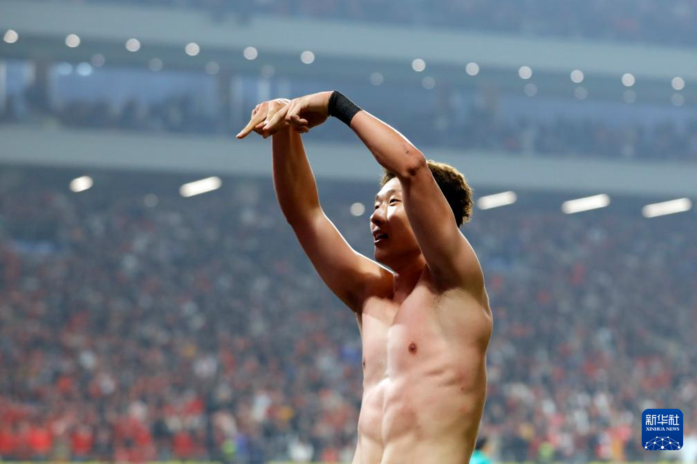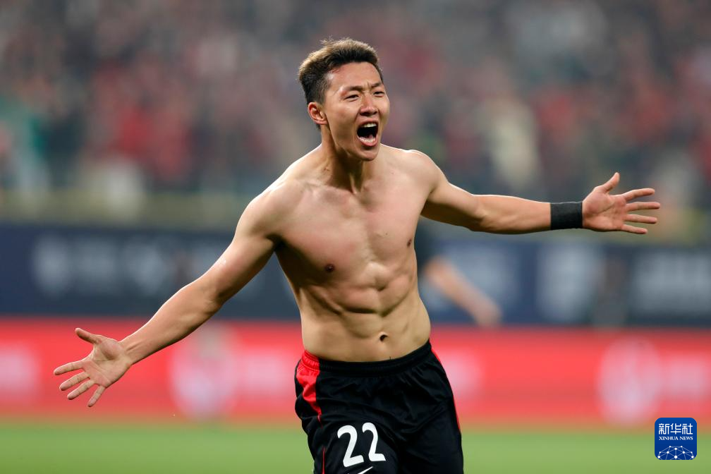 3月2日,成都蓉城队球员李扬庆祝进球。新华社记者 沈伯韩 摄