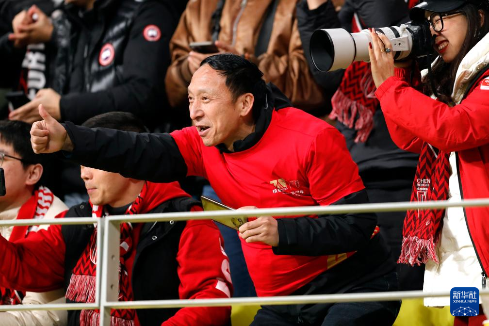 3月2日,成都蓉城队球迷在比赛中庆祝进球。新华社记者 沈伯韩 摄