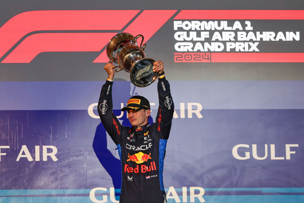 3月2日,维斯塔潘在颁奖仪式上举起冠军奖杯。新华社发(钱俊 摄)