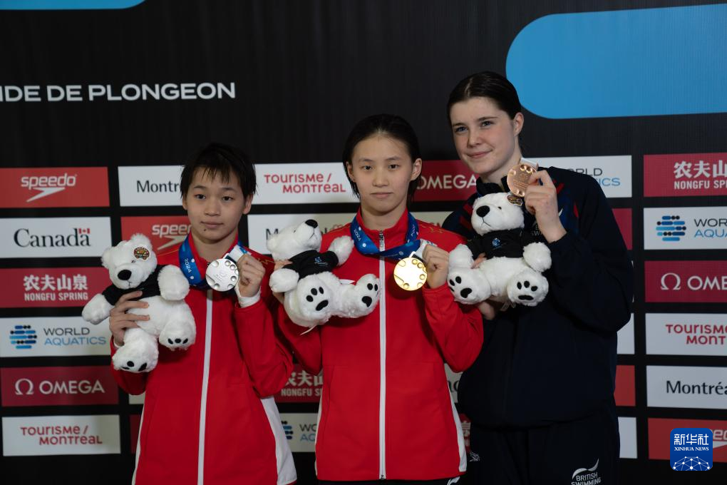3月3日,亚军全红婵(左)、冠军陈芋汐(中)、季军英国选手西里埃在颁奖仪式上。新华社发(刘佳欢摄)