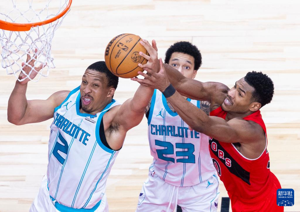 3月3日,黄蜂队球员格兰特·威廉姆斯(左)、特雷·曼(中)与猛龙队球员阿巴吉在比赛中争抢篮板球。新华社发(邹峥摄)