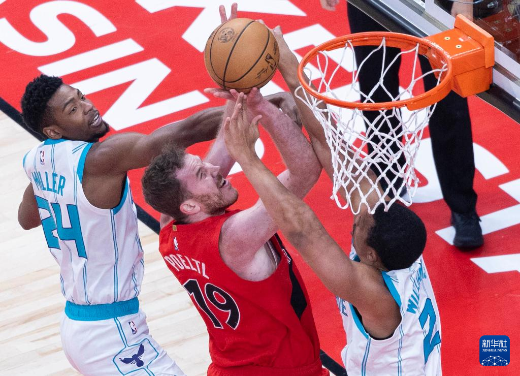 3月3日,猛龙队球员珀尔特尔(右)在比赛中封盖黄蜂队球员米西奇(中)。新华社发(邹峥摄)