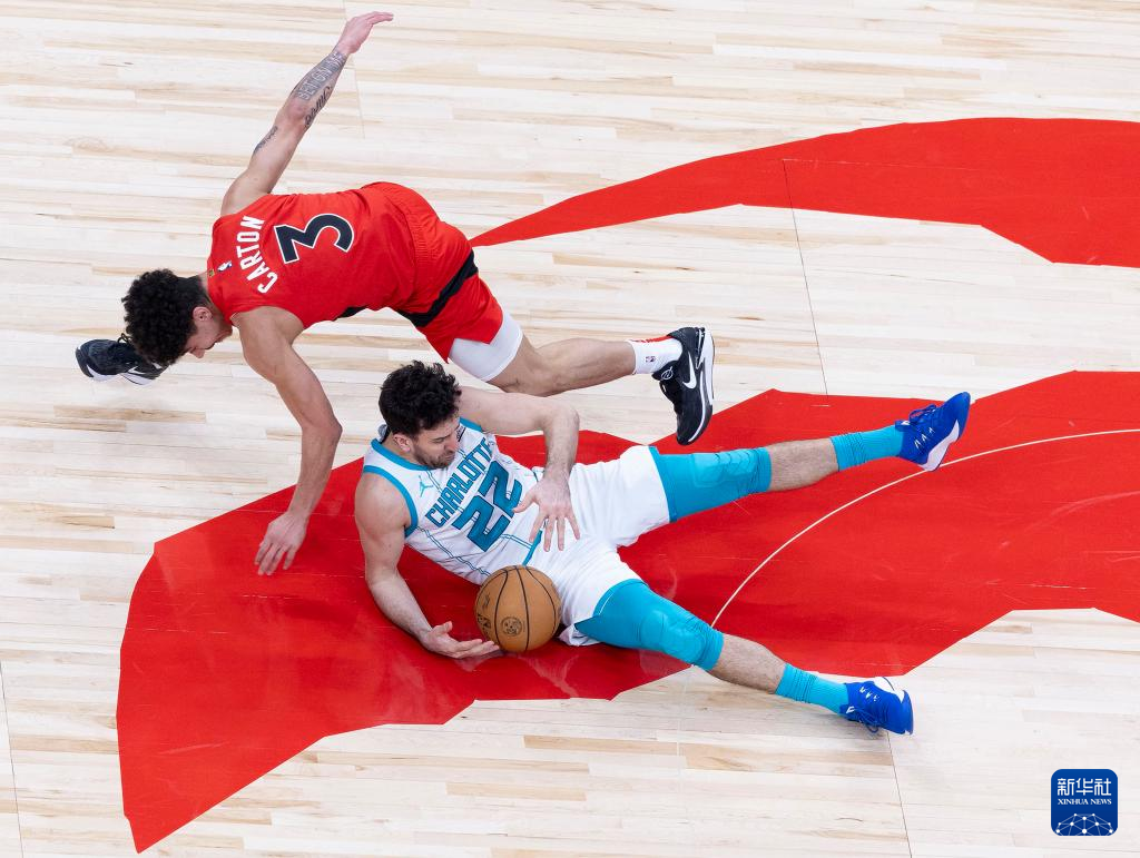 3月3日,黄蜂队球员米西奇(右)与猛龙队球员卡顿在比赛中拼抢。新华社发(邹峥摄)