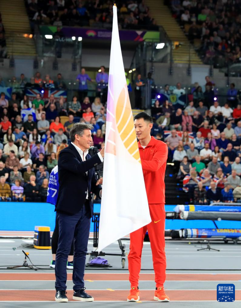3月3日,世界田联主席塞巴斯蒂安·科(左)在会旗交接仪式上将世界田联旗帜交给中国田径运动员王嘉男。2025年室内田径世锦赛将在中国南京举行。新华社记者 李颖 摄