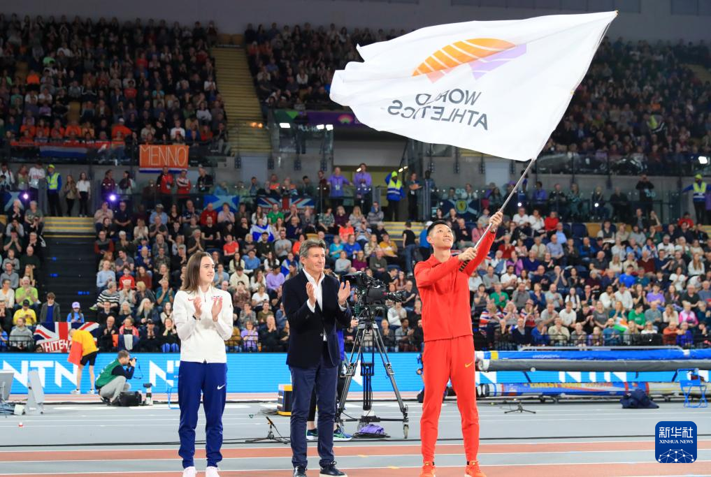 3月3日,中国田径运动员王嘉男(右)在会旗交接仪式上挥舞世界田联旗帜。2025年室内田径世锦赛将在中国南京举行。新华社记者 李颖 摄