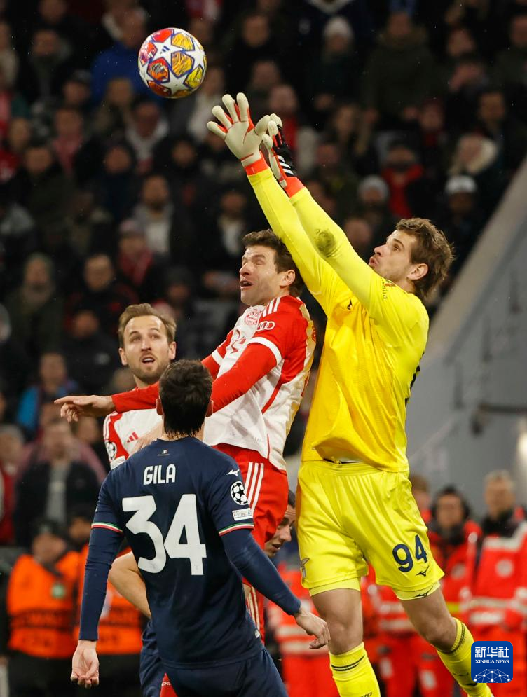 3月5日,拜仁慕尼黑队球员穆勒(右二)与拉齐奥队守门员普罗维德尔(右一)在比赛中拼抢。新华社发(菲利普·鲁伊兹摄)