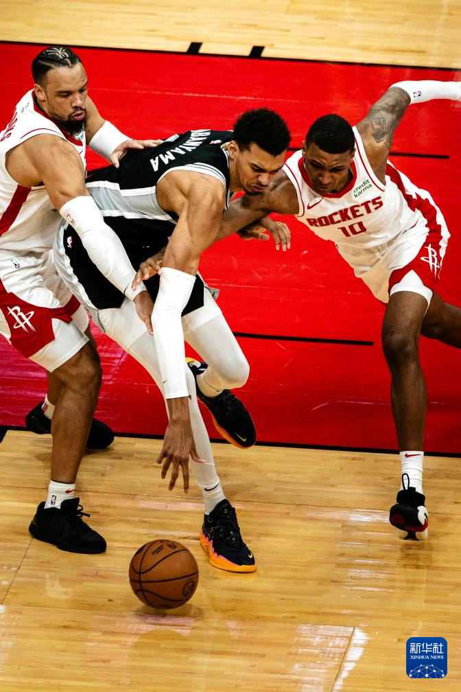 3月5日,火箭队球员狄龙·布鲁克斯(左)、贾巴里·史密斯(右)和马刺队球员维克托·文班亚马在比赛中拼抢。新华社发(陈晨摄)