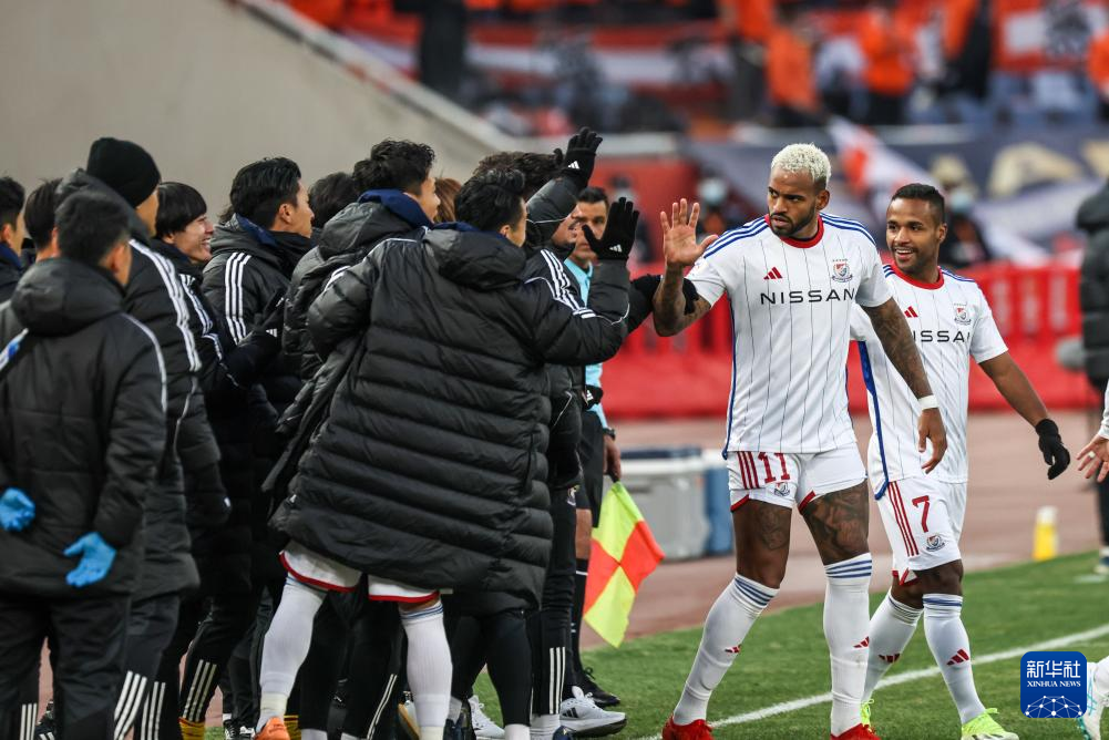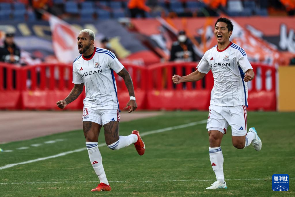 3月6日,横滨水手队球员安德森·洛佩斯(左)在比赛中庆祝进球。新华社记者 朱峥 摄