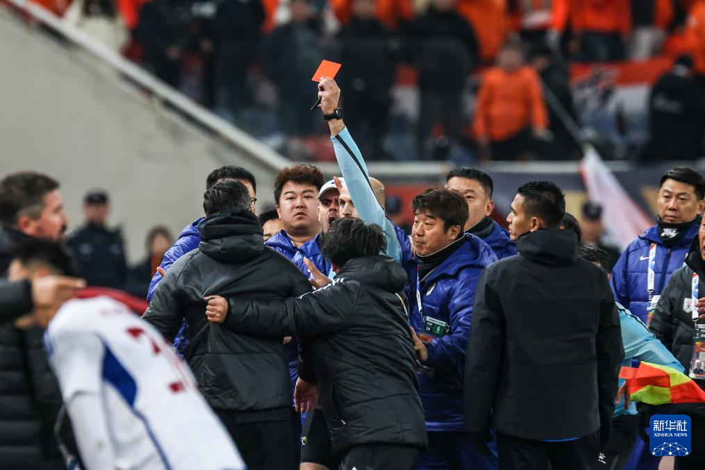 3月6日,主裁判向横滨水手队工作人员出示红牌。新华社记者 朱峥 摄