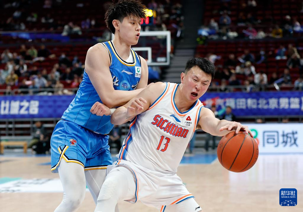 3月7日,北京北汽队球员曾凡博(左)在比赛中防守四川金强队球员左朕年。新华社记者 王丽莉 摄