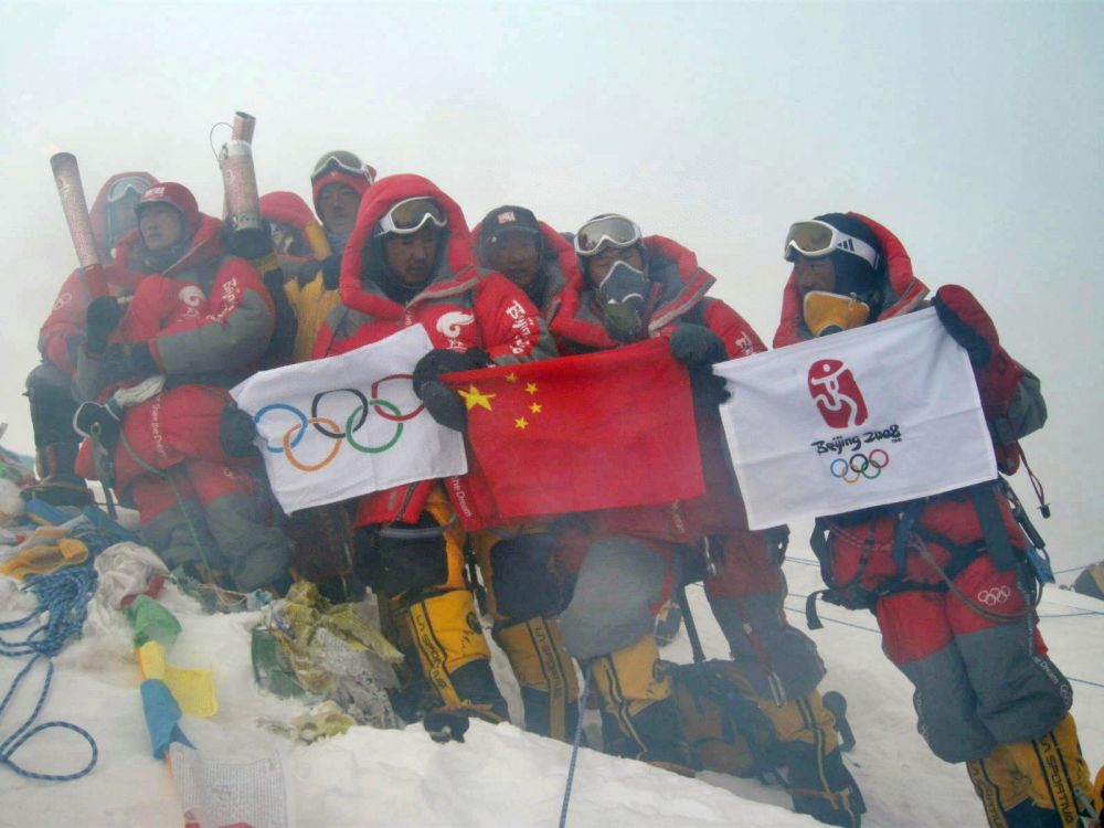2008年5月8日,北京奥运圣火珠峰传递登山队成功登顶珠峰,中国登山队员在峰顶展示中国国旗、奥运五环旗和北京奥运会会徽旗。新华社发