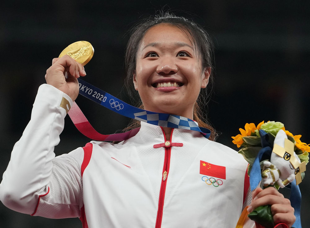 2021年8月7日,冠军刘诗颖在东京奥运会田径项目女子标枪颁奖仪式上。新华社记者 吕小炜 摄
