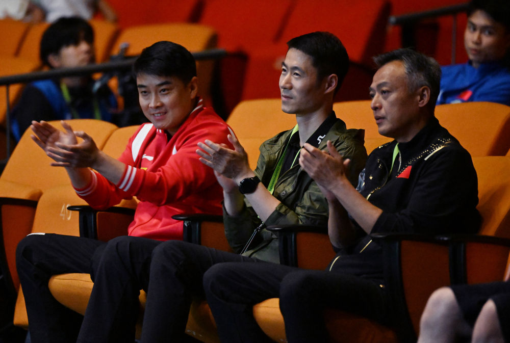 2023年5月26日,中国乒乓球协会副主席王励勤(中)在南非德班进行的2023年世界乒乓球锦标赛男子单打四分之一决赛中观战。新华社记者 陶希夷 摄