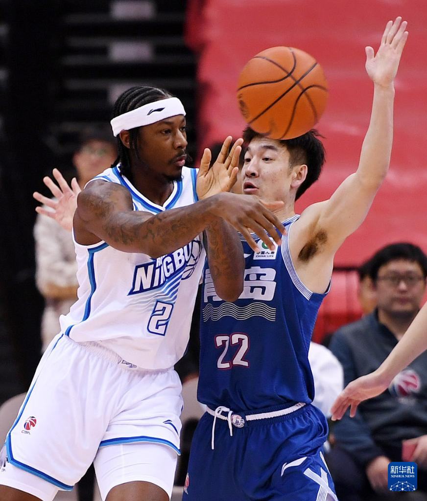 3月7日,青岛国信水产队球员王洪(右)防守宁波町渥队球员古德温传球。新华社记者 李紫恒 摄