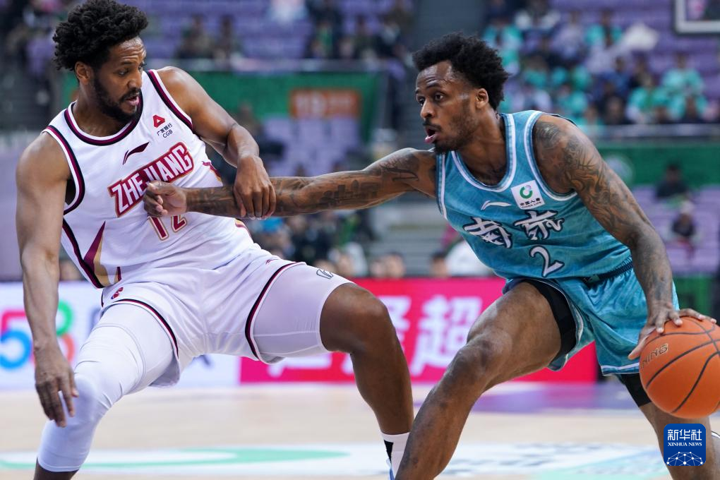 3月7日,南京头排苏酒队球员布莱克尼(前左)与浙江稠州金租队球员陆文博(前右)在比赛中拼抢。新华社记者 李博 摄