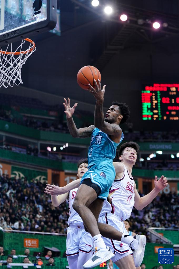 3月7日,南京头排苏酒队球员布莱克尼(上)在比赛中突破上篮。新华社记者 李博 摄