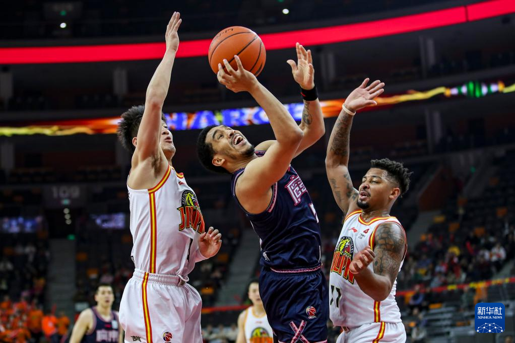 3月9日,广东华南虎队沃特斯(中)在比赛中上篮。
