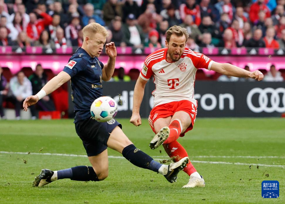 3月9日,拜仁慕尼黑队球员凯恩(右)在比赛中射门。