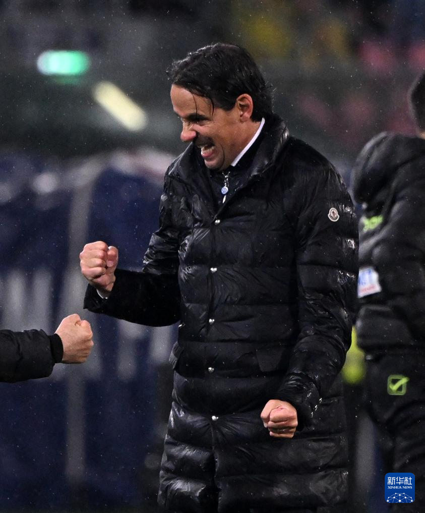 3月9日,国际米兰队主教练因扎吉在赛后庆祝胜利。