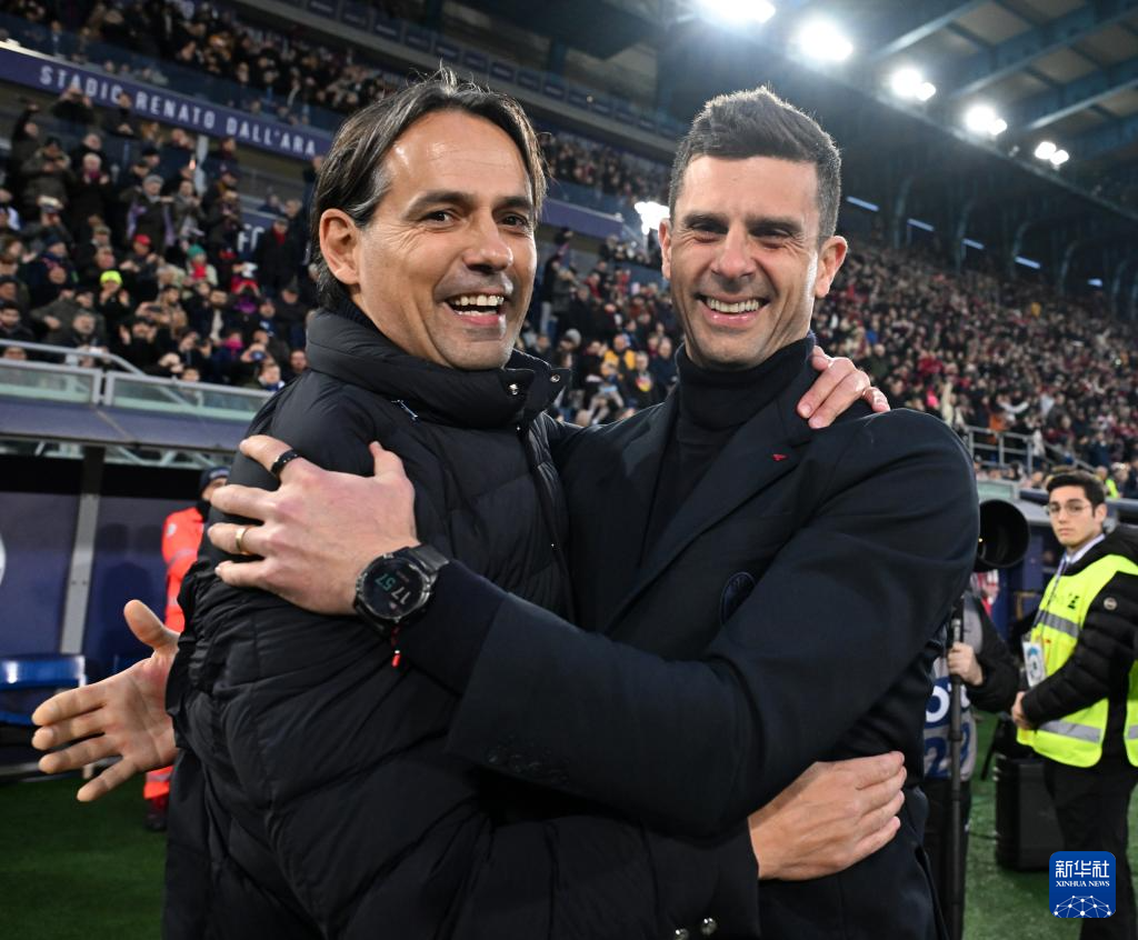 3月9日,国际米兰队主教练因扎吉(左)和博洛尼亚队主教练莫塔在赛前。