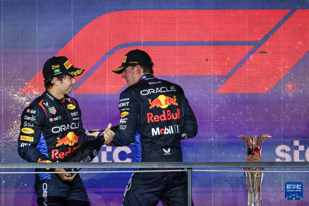 3月9日,佩雷兹和维斯塔潘(右)在颁奖仪式上喷洒饮料庆祝。