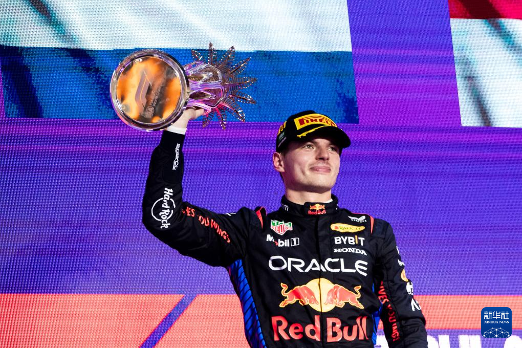 3月9日,维斯塔潘在颁奖仪式上举起奖杯。