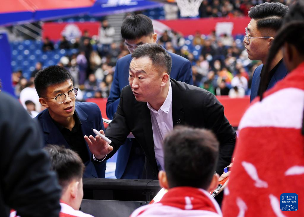 3月9日,青岛国信水产队主教练刘维伟(中)在比赛暂停阶段向队员布置战术。