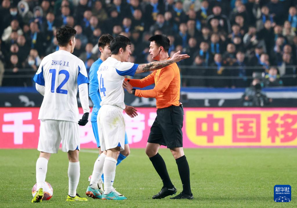 3月9日,武汉三镇队球员姜至鹏(右二)与主裁判李海新(右一)在比赛中沟通。