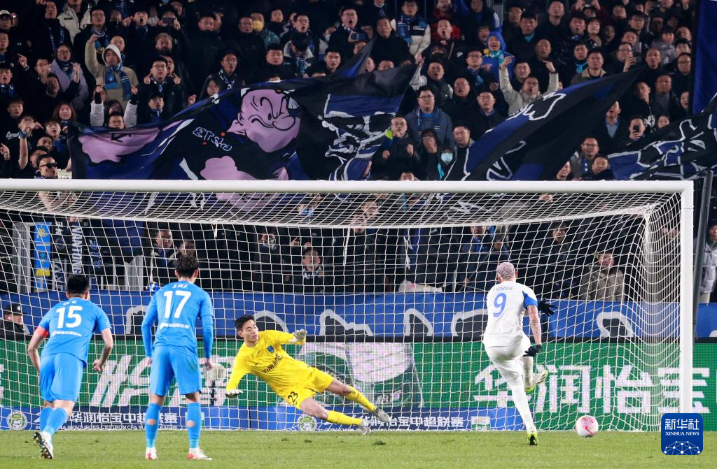 3月9日,武汉三镇队球员恩里克(右一)主罚点球得分。