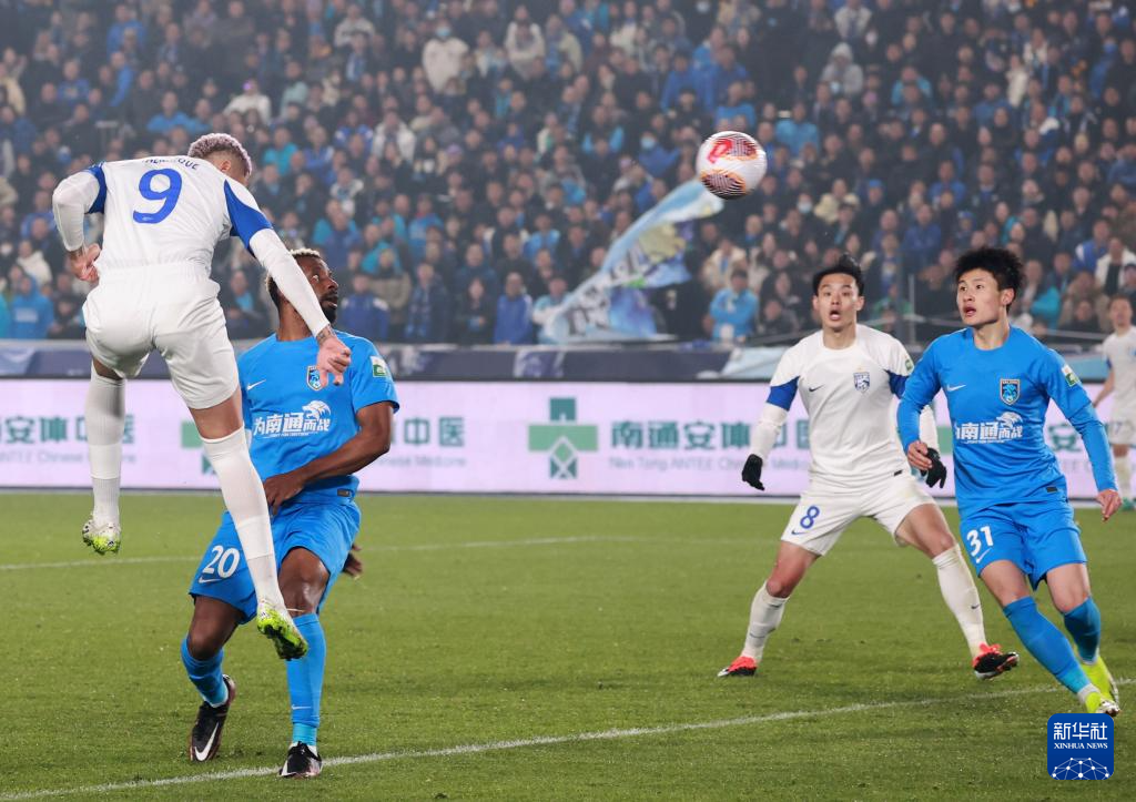3月9日,武汉三镇队球员恩里克(左一)在比赛中头球攻门得分。