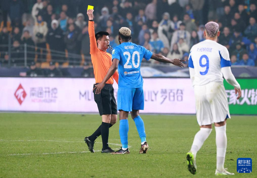 3月9日,主裁判李海新(左)向南通支云队球员安东尼(中)出示黄牌。