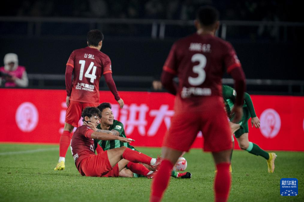 3月9日,浙江队球员岳鑫(下右)与上海海港队球员王燊超(下左)在比赛中摔倒后。