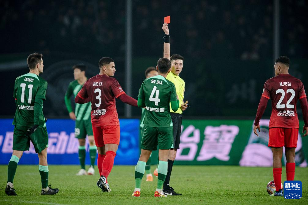 3月9日,主裁判麦麦提江(右二)在比赛中向浙江队球员孙正傲(右三)出示红牌。