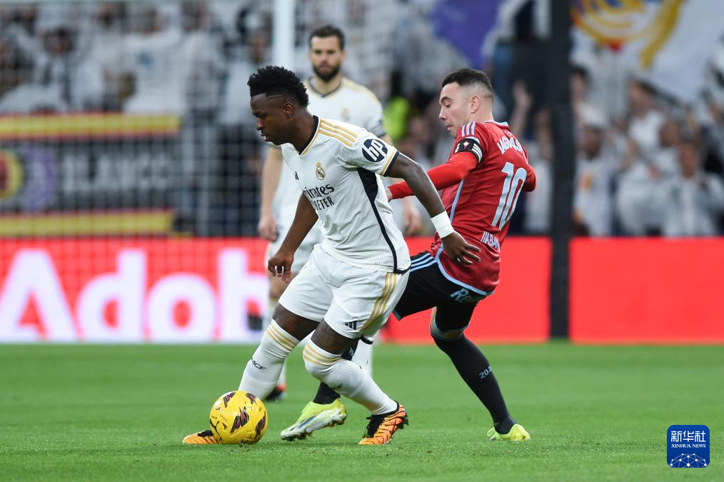 3月10日,皇家马德里队球员维尼修斯(左)与塞尔塔队球员阿斯帕斯在比赛中拼抢。新华社发(古斯塔沃·巴连特摄)