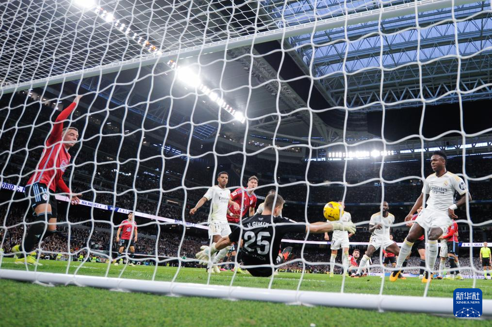 3月10日,皇家马德里队球员维尼修斯(左三)在比赛中射门得分。新华社发(古斯塔沃·巴连特摄)