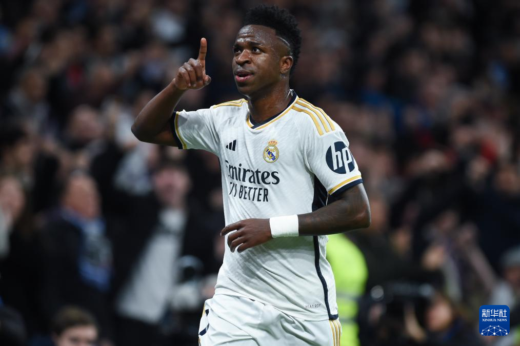 3月10日,皇家马德里队球员维尼修斯在比赛中进球后庆祝。新华社发(古斯塔沃·巴连特摄)