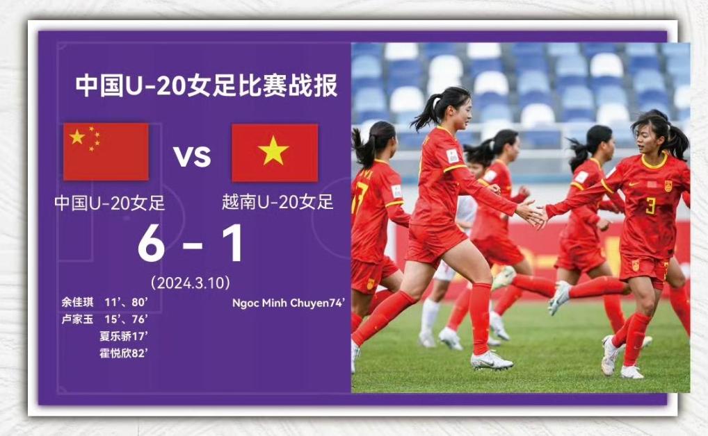 本场比赛,面对小组实力最弱的越南队,中国队在上、下半场各入三球。余佳琪、卢家玉均有两球入账,夏乐骄、霍悦欣各打入一球。越南队在第74分钟打进球队本届赛事的唯一进球。