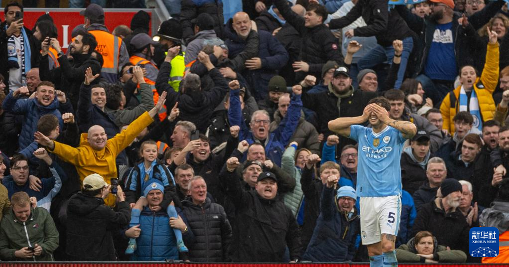 3月10日,曼彻斯特城队球员斯通斯(前)庆祝进球。新华社发