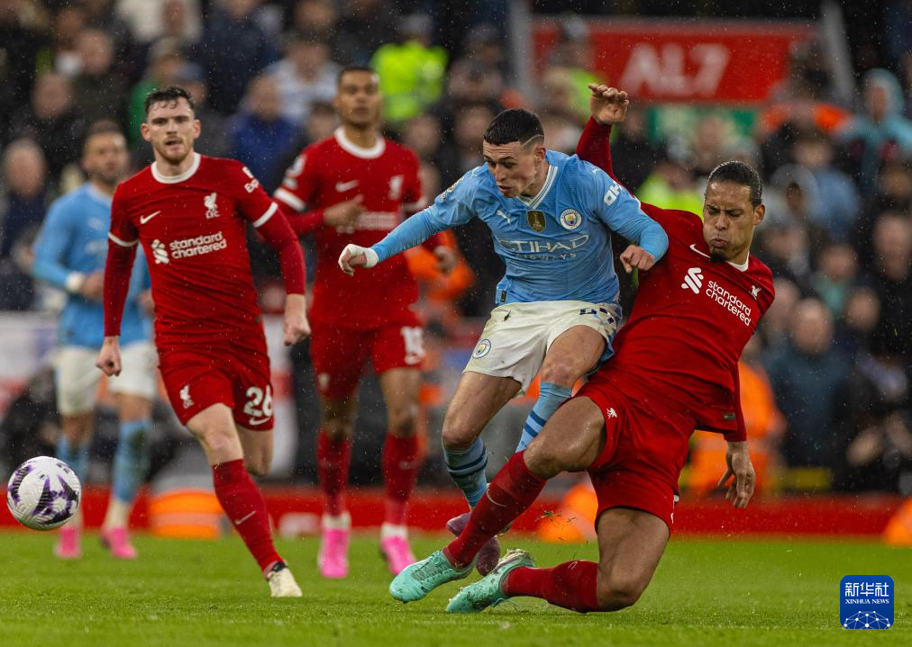 3月10日,利物浦队球员范戴克(右一)与曼彻斯特城队球员福登(右二)拼抢。新华社发