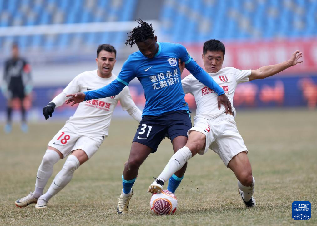 3月10日,沧州雄狮队球员所罗门·奥塔博尔(中)和成都蓉城队球员唐鑫(右)、安德里戈拼抢。新华社发(周洋摄)